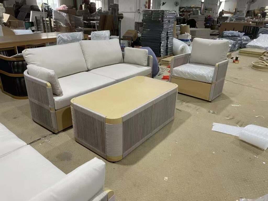 It is made of rope and teak wood. It is a 2 seats sofa set. Welcome to custom-made.