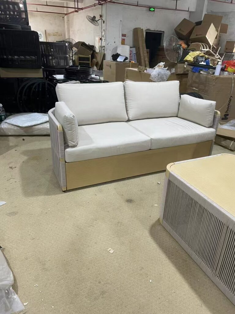 It is made of rope and teak wood. It is a 2 seats sofa set. Welcome to custom-made.